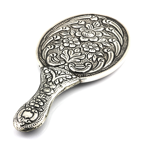 6,50 gram 925 ayar gümüşten üretilmiş gümüş ayna için kullanılan maden rengi beyazdır. Fotoğraftaki gümüş sultan el aynası çiçekli model firmamız tarafından garantilidir.